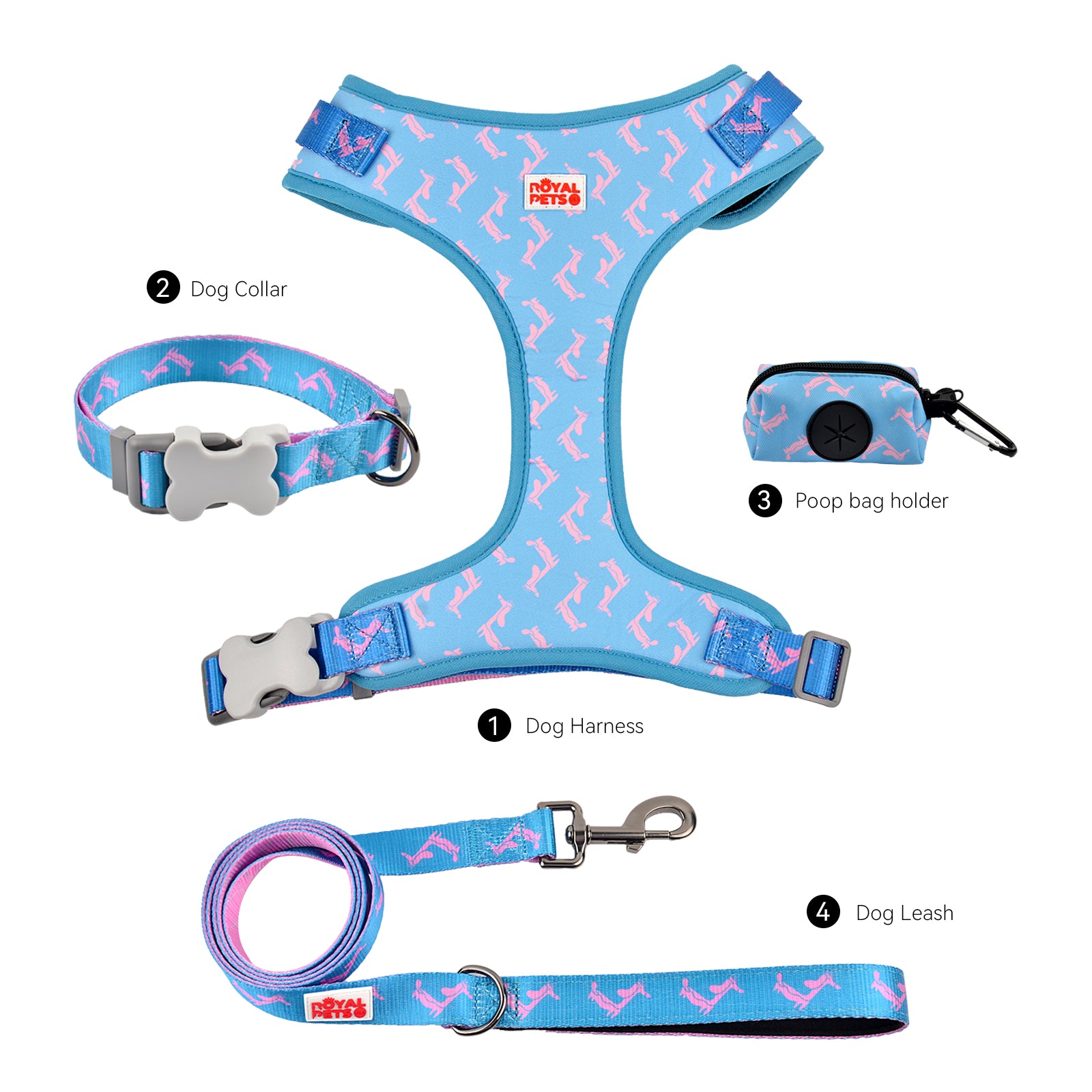 Royal Pets Pet Harness 4 Pcs Set with Leashes, Collars & Poop Bag Holder